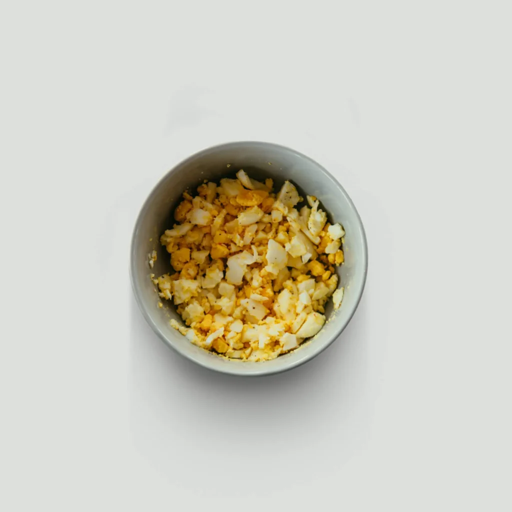 1. Chop the yolks and whites and mix them in one dish.