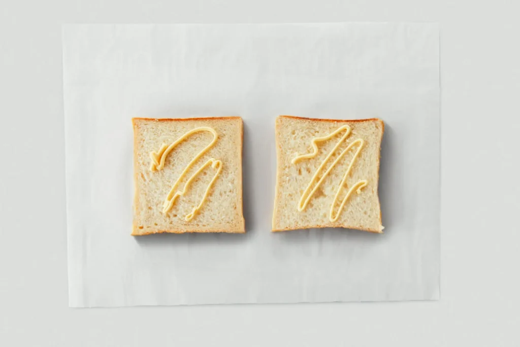 1. Place two slices of almond milk bread on a sheet of cooking paper and spread mayonnaise on both.