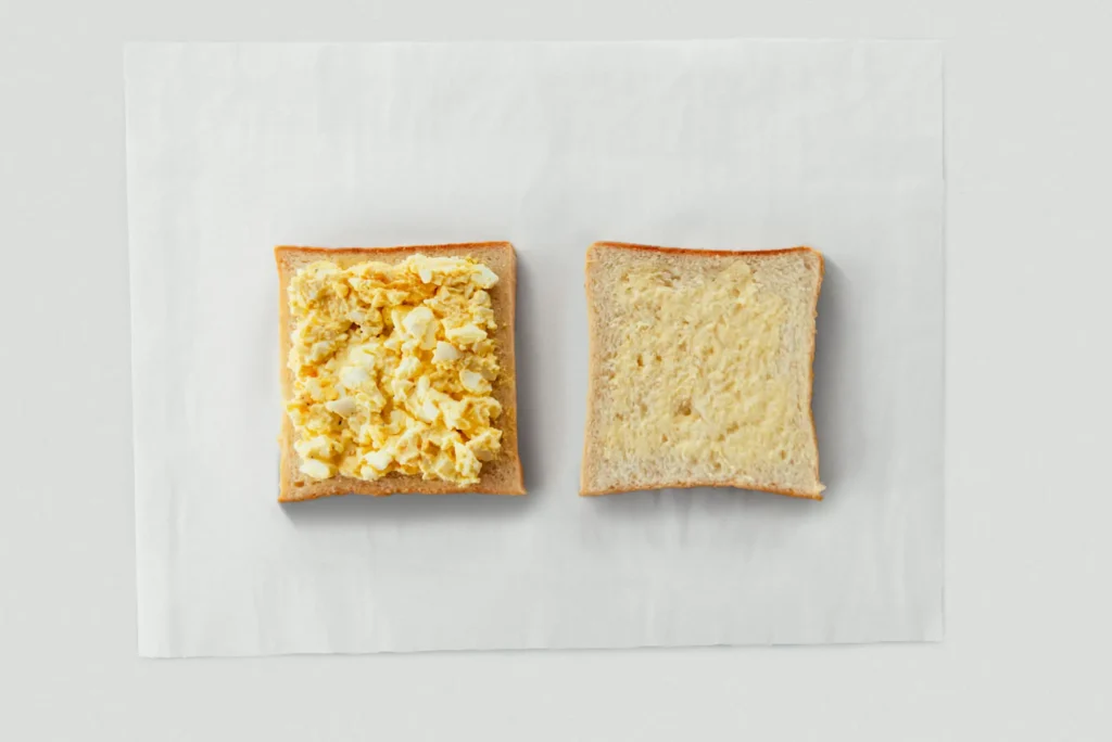 1. Place egg salad on almond milk bread with mayonnaise and spread egg salad gently toward all four corners.