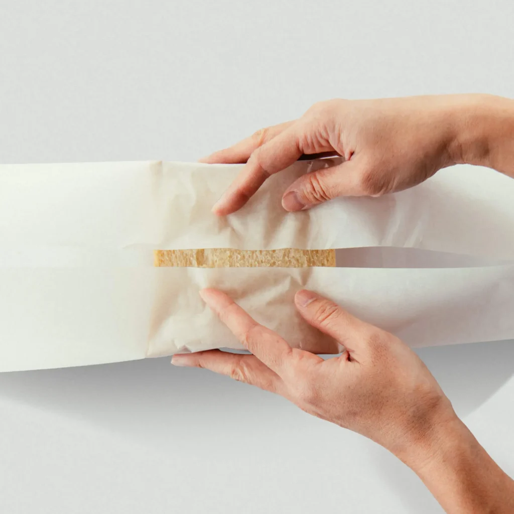 1. Place another slice of bread on top, fold the cooking paper over the top and bottom, and wrap the egg sandwich.